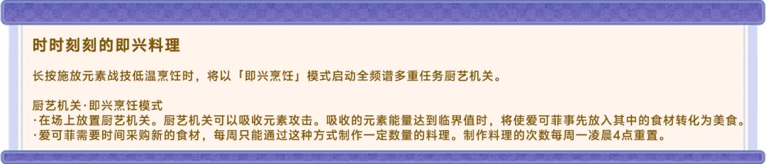 爱可菲可以在场上放置厨艺机关,并以即兴烹饪模式启动全频谱多重任务厨艺机关。即兴烹饪模式下的厨艺机关可以吸收元素攻击。并在吸收的元素能量达到临界值时,将使爱可菲事先放入其中的食材转化为美食。