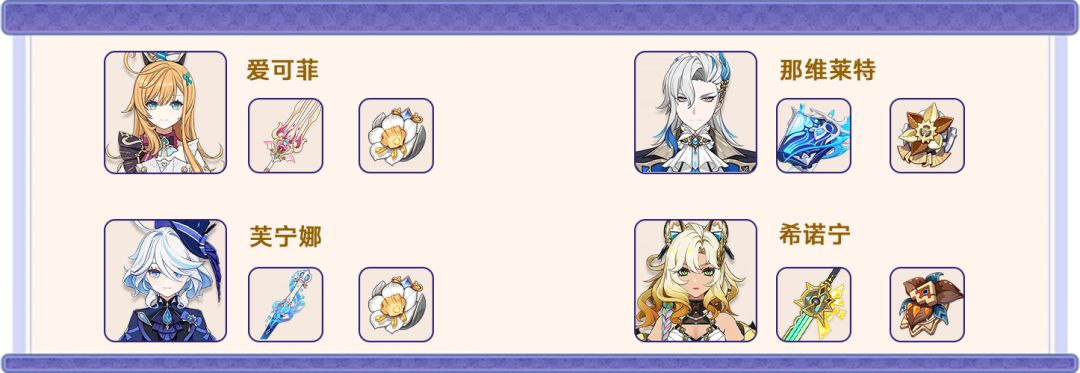 解析:这一队伍是通过各种强力辅助的作用而形成的以水元素伤害为主要输出类型的队伍。在该队伍中,爱可菲可以提供小额的冰,水元素抗性降低效果,起到后台持续输出作用与一定的治疗作用,与芙宁娜以血量变化(刚需冶疗)为契机的增伤互补,构成了一个逻辑比较合理的组合,可以为冰,水元素输出角色(仅以“那维莱特″为例)提供大量增益效果。而希诺宁的加入则更为该队伍提供了一定的非水冰元素入队的抗性补正并依靠烬城套提供了一定的增伤,使输出角色的伤害进一步的提升,从而构建该队伍。