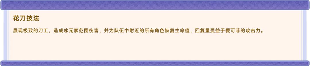 爱可菲的治疗手段主要由【元素爆发:花刀技法】与其【天赋:美食胜过良药】构成: