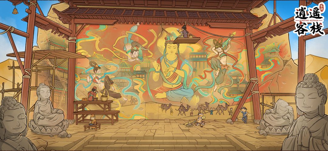 壁画中,天与地,神与人,共处一幅祥和的画卷。佛祖的眼神温柔注视着众生,仙女轻扬的丝带似要飘出画外,连那遥远的沙丘都凝固在时间里,诉说着信仰与命运的交织。