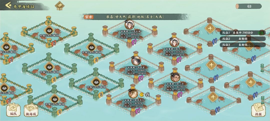 2.玩家进入海域后自动分配海域。每处海域有35个龟甲采集点。采集点按级别分为1-7级,级别越高,产出龟甲的数量就越多。建议去更高级别的采集点!注意:有些级别高的采集点还没有开放!