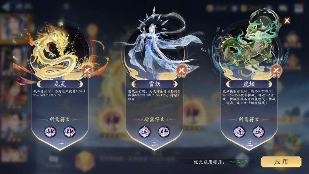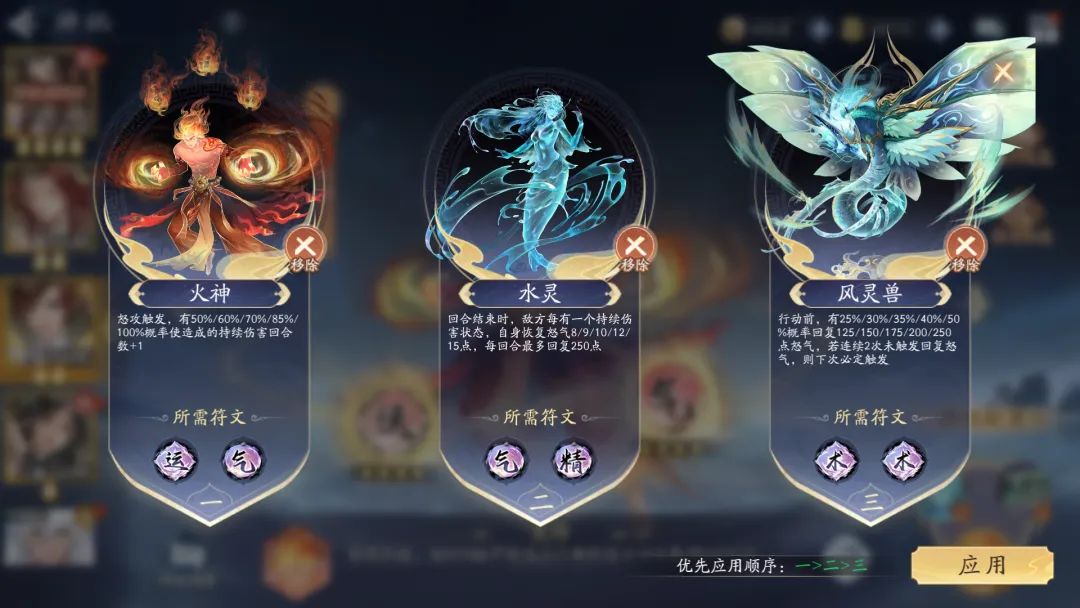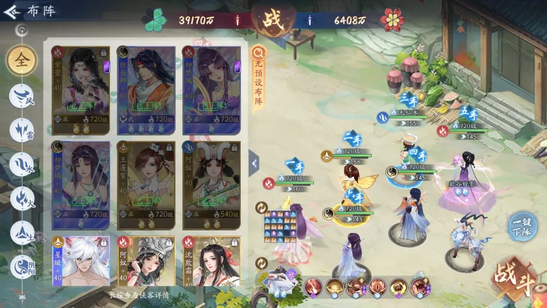 站位:阴阳徐长卿+火柳梦璃+阴阳柳梦璃+火紫萱+土王篷絮+无怒攻水阿奴或阴阳紫萱+无怒攻阴阳柳梦璃,站位随意,火柳梦璃攻击第一、速度第一,宠物技能为先猫后鹿。使用火紫萱的原因,主要是能够上气精多一个回复怒气手段,并且还有双怒攻的赤炎协助,让火柳梦璃的输出更加频繁。