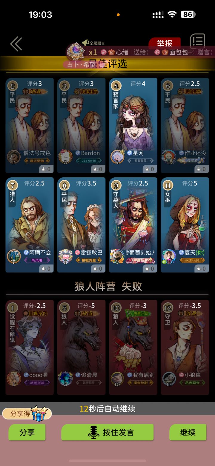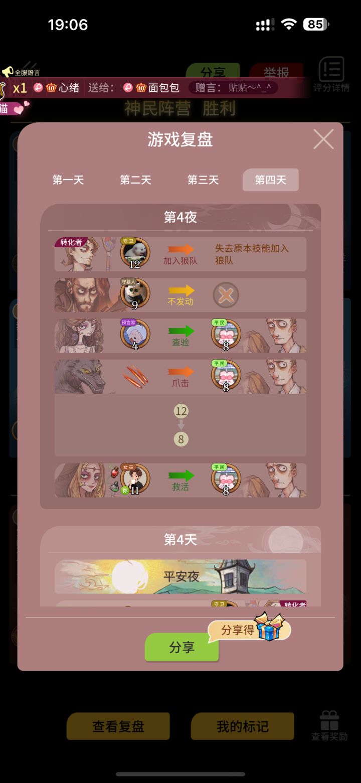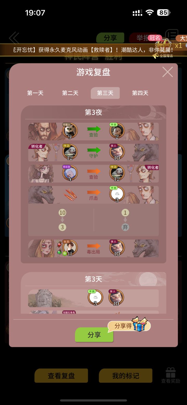 拿了一把五分女巫,第四天夜里还有解药救了最后一个8号平民