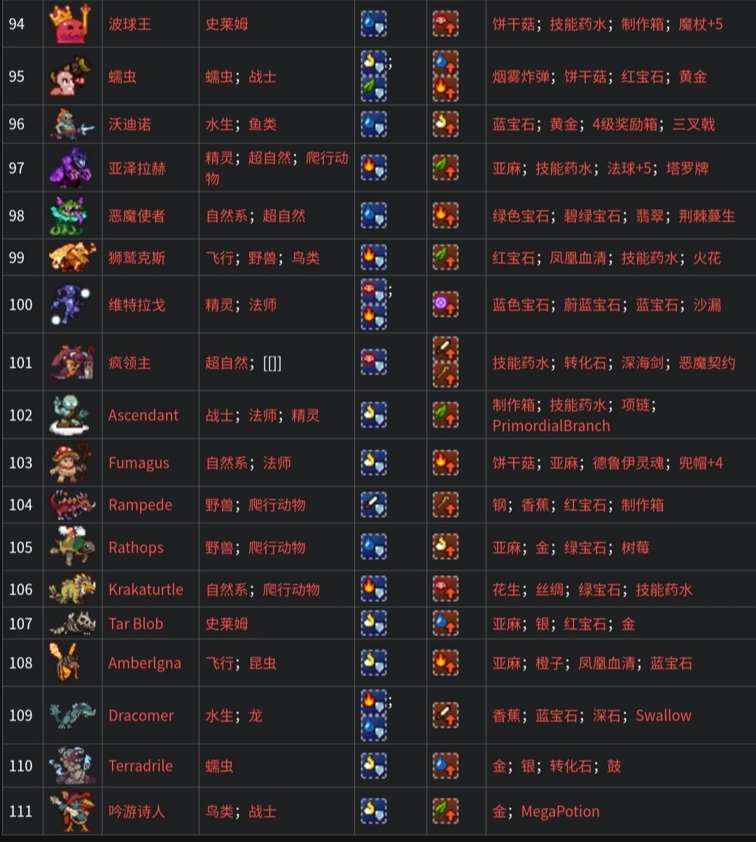 全魔物种族、抗性、掉落物表(共111只)