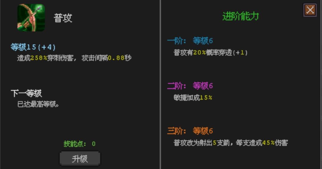 普攻的3阶能力:普攻改为5支箭,每支箭造成45%的伤害。