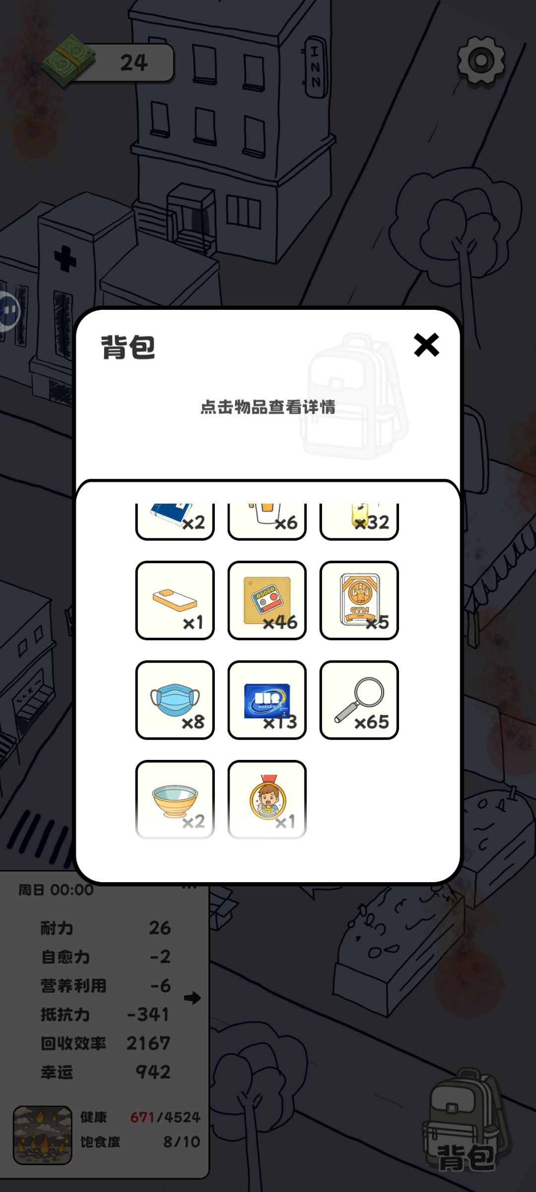 p1:鸡腿x62 甜甜圈x115 还有些无聊狂吃的消耗 吃不完 根本吃不完 那是我想捡吃的吗?这玩意儿纯挡位置啊 退一步讲 吃的就不能卖吗?