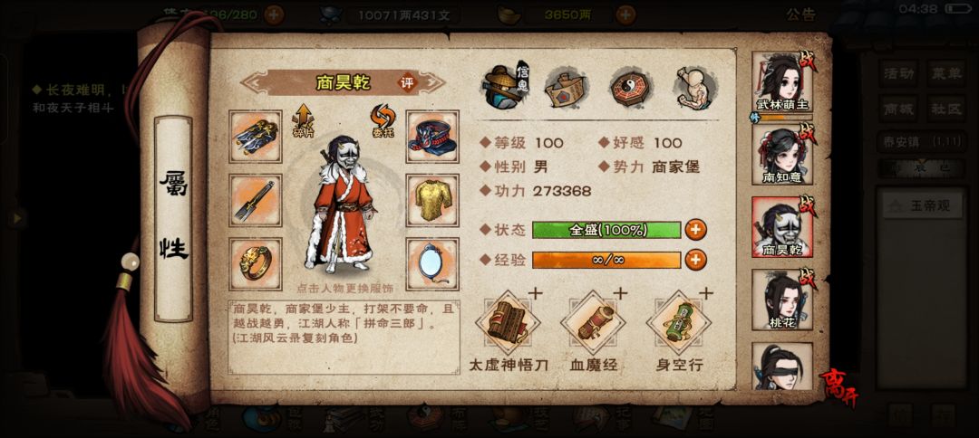太虚双破输出,血魔回血,保护后排双随从,可以搭配五狱西子或大奔雷等双破武学提高输出;
