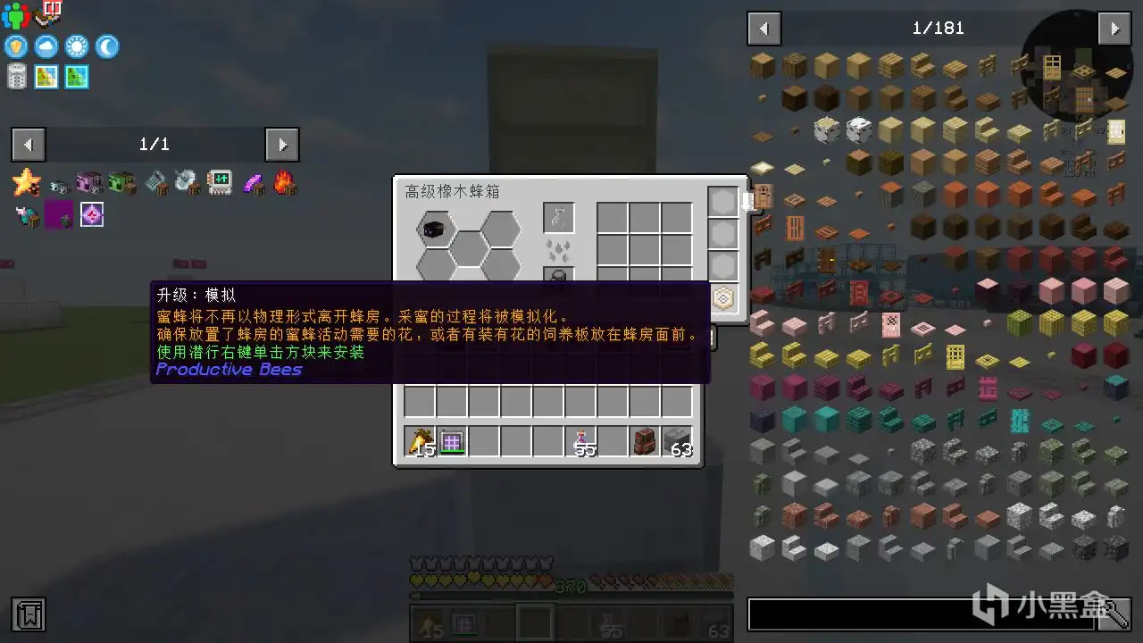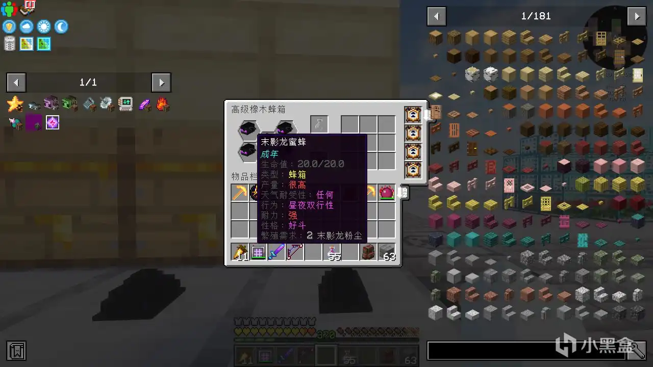一定要看清楚,饲养板在高级蜂箱下面一格。摆好之后,往高级蜂箱里放升级模拟,即可把五只末影龙蜜蜂放入,让他们模拟采蜜。