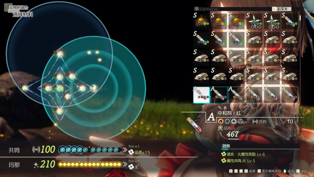 本作的炼金系统核心是共鸣和玛娜,素材拥有不同的共鸣值和共鸣范围,投入素材时会触发素材本身的共鸣,而在共鸣范围的素材会触发二次共鸣,被囊括在共鸣范围的玛娜也会被吸收,这套玩法就构成了本作炼金系统的基础,而投入素材的材料槽也有不同的特性,这些则构成了炼金系统的进阶部分。咋一听感觉好像还挺不错的,可惜炼金系统做减法的地方把这套系统的深度给锁死了。