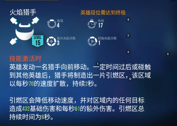 英雄发动一名猎手向前移动。一定时间过后或碰触到其他英雄后,猎手将制造出一片引燃区,。该区域以每秒70的速度扩散,持续2秒。引燃区会降低移动速度,并对区域内的任何目标造成基础伤害和每秒的额外伤害。引燃区会持续时间一定时间。