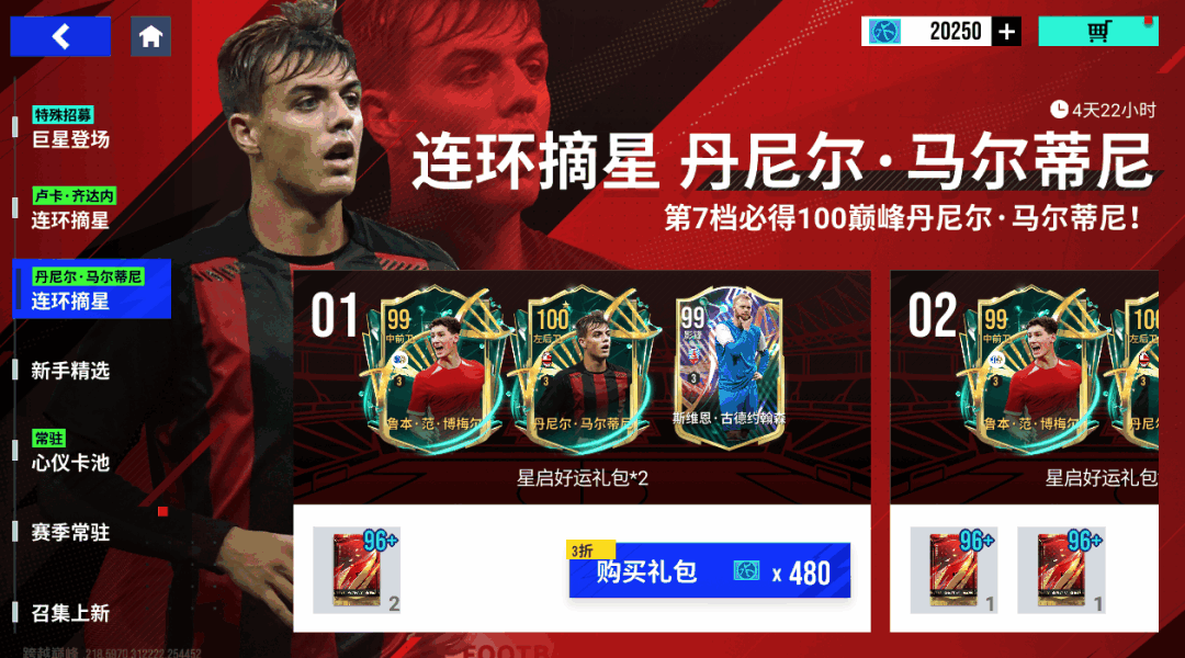 6月15日11:00-6月23日11:00期间,通过参与活动购买连锁礼包,有机会获取100潜力值突变巅峰丹尼尔·马尔蒂尼、99潜力巅峰鲁本·范·博梅尔!