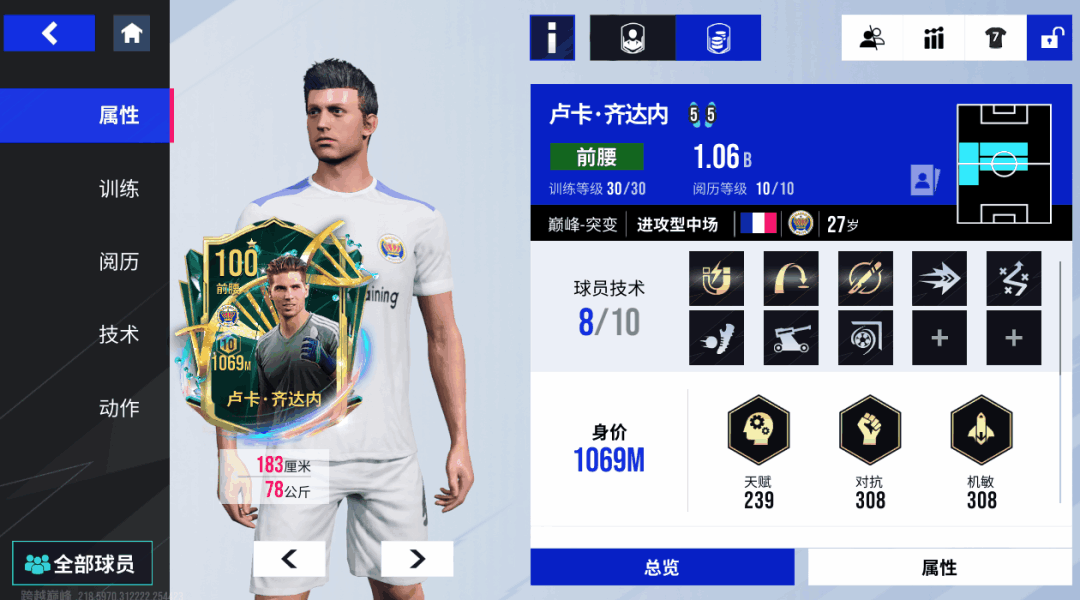 这张100潜力巅峰突变卢卡-齐达内也是成功“请神”到了自己的父亲,作为球场上的前场核心,他的传带能力极其亮眼,106的控球和灵活以及108的短传,数据在同位置中遥遥领先,更不论他还有自带的金色【球感】【挑传】【直塞】技术和【精密带球】【大力传球】技术,让他如虎添翼,在前场宛入无人之境,凭借炉火纯青的盘带过掉一个又一个试图上抢拦截的对手,送出妙到毫巅的精准传球!除了给队友做饼之外,他自己带球单干的能力也颇有齐祖的风采,104的远射和射门力量就已经足够对面门将“喝一壶”了,还自带【重炮】【一脚射门】【搓射】技术,更是让他的外围发难难以应对,成为打入十分角的穿喉利剑!