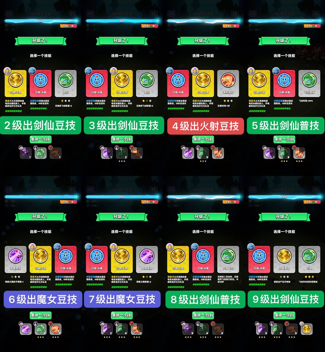 如图,我通过这样的技巧,7级前已经完成了双C的两个升级豆技,而我在第8级的时候没有选择继续拿剑仙的普通技能,而是拿了一个天使。目的是下一轮能多一个技能选择,如果没有主C的升级豆技那就可以使用刷新即可,而我们的9级直接刷出了剑仙最后一个豆技,那基本就能在10波小boss前觉醒。
