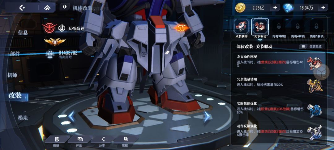 需要注意的点就是,为了尽可能发挥天帝高达的持续伤害能力多打积分,最好能给天帝研发到传奇2以上,改造选择对燃烧、过载、爆炸目标伤害增加40%,模块选择回能、吸能,能更快的叠加燃烧层数,尽可能提高伤害积分。