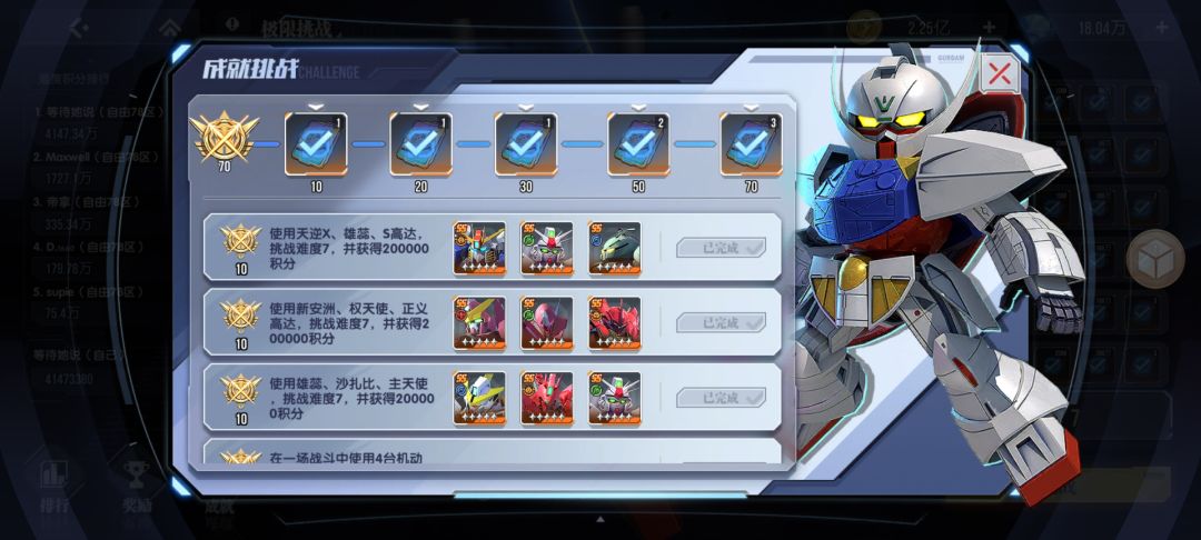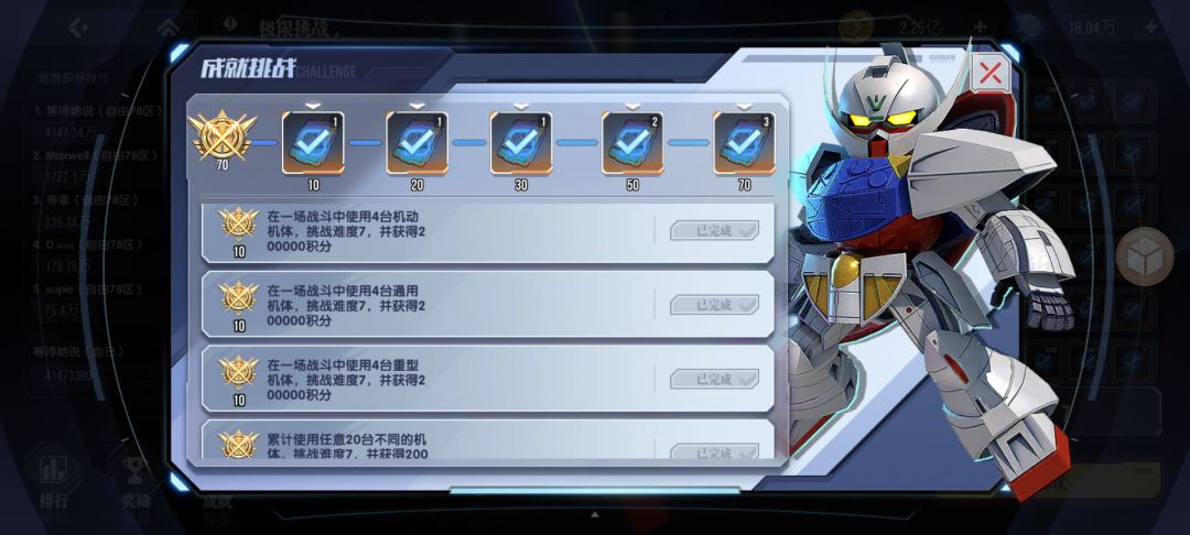7、累计使用20台不同机体达成200000积分推荐阵容:天帝高达、翔翼型强袭高达+其他没上过场的随便搭配一下就能完成。