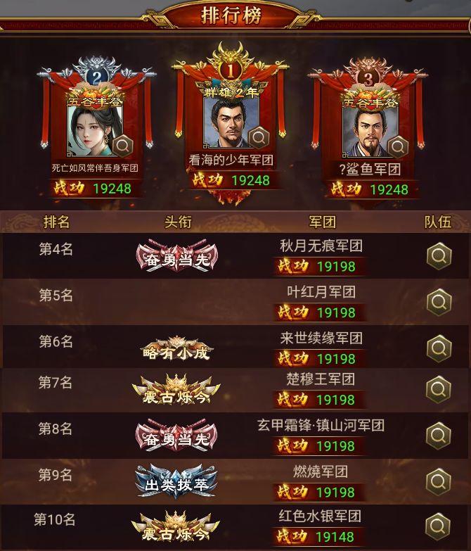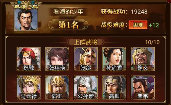 在本次战役中,看海的少年 军团以 19248 的战功摘得桂冠,攻克困难+12,恭喜!