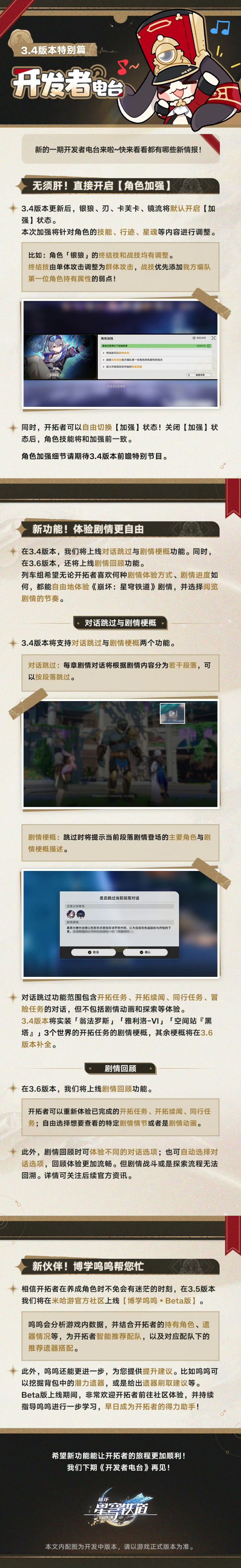 2025年6月16日,崩铁制作组发布3.4版本开发者电台,表示将支持剧情跳过功能。