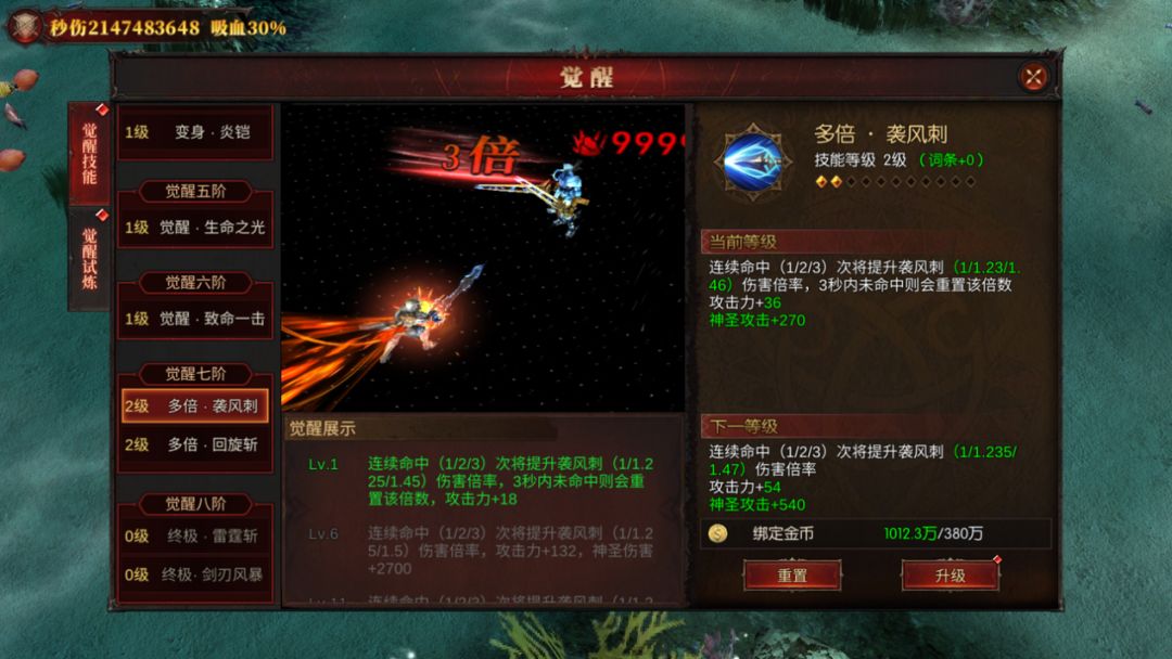 七阶:推荐选择【多倍·袭风斩】,一转装备的金色词条优先选择它,理由上面说了放弃觉醒袭风刺的重置技能概率,方便衔接后续其他技能;