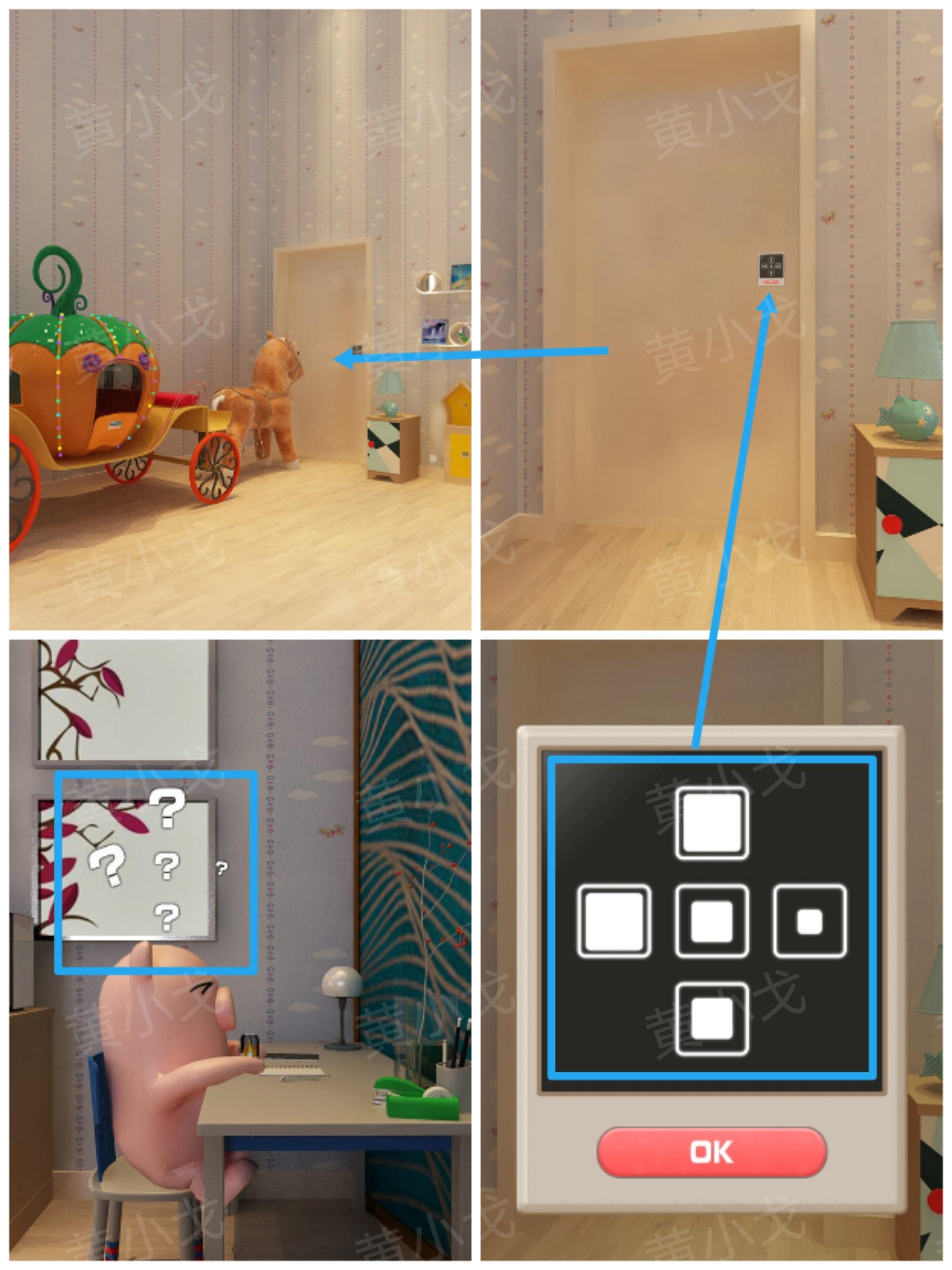 15.点击门上的密码锁,根据[茶室]场景猪猪头上的问号线索,调整密码锁,打开门