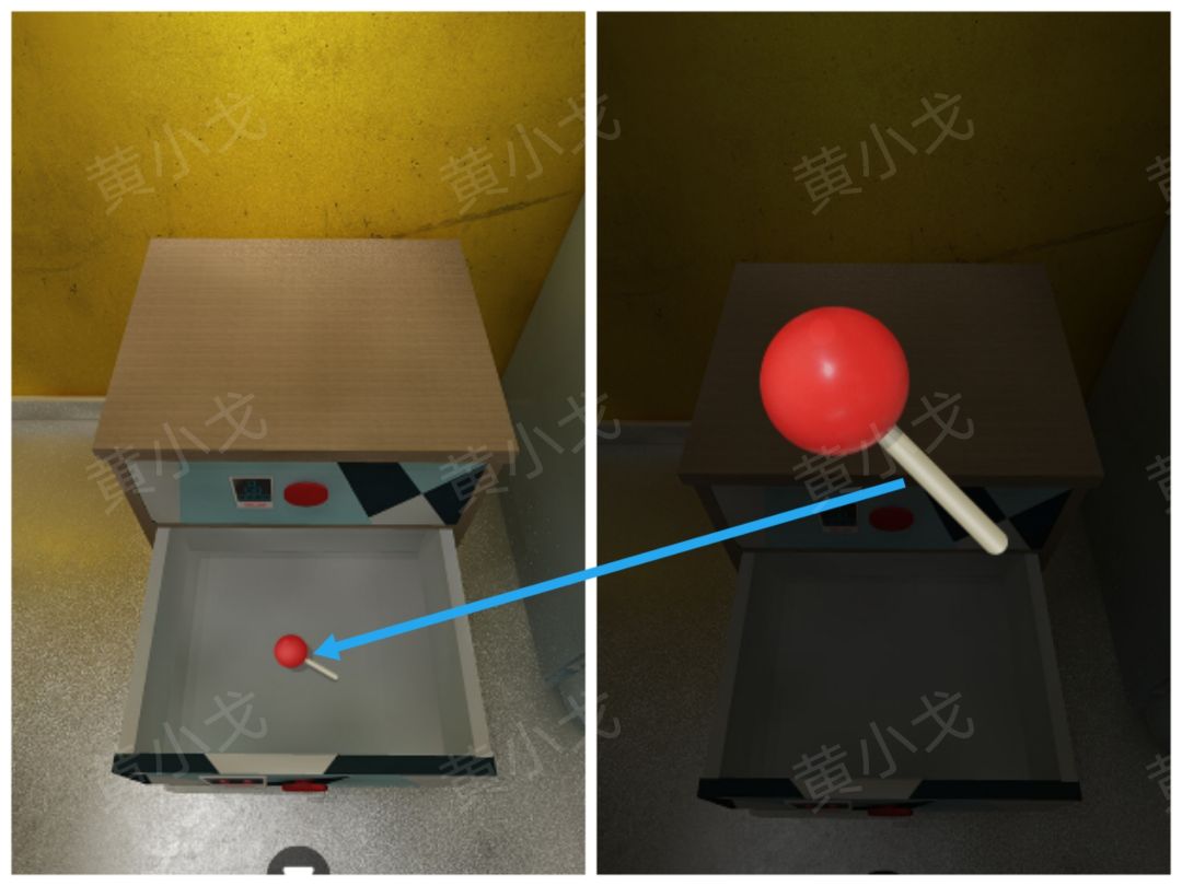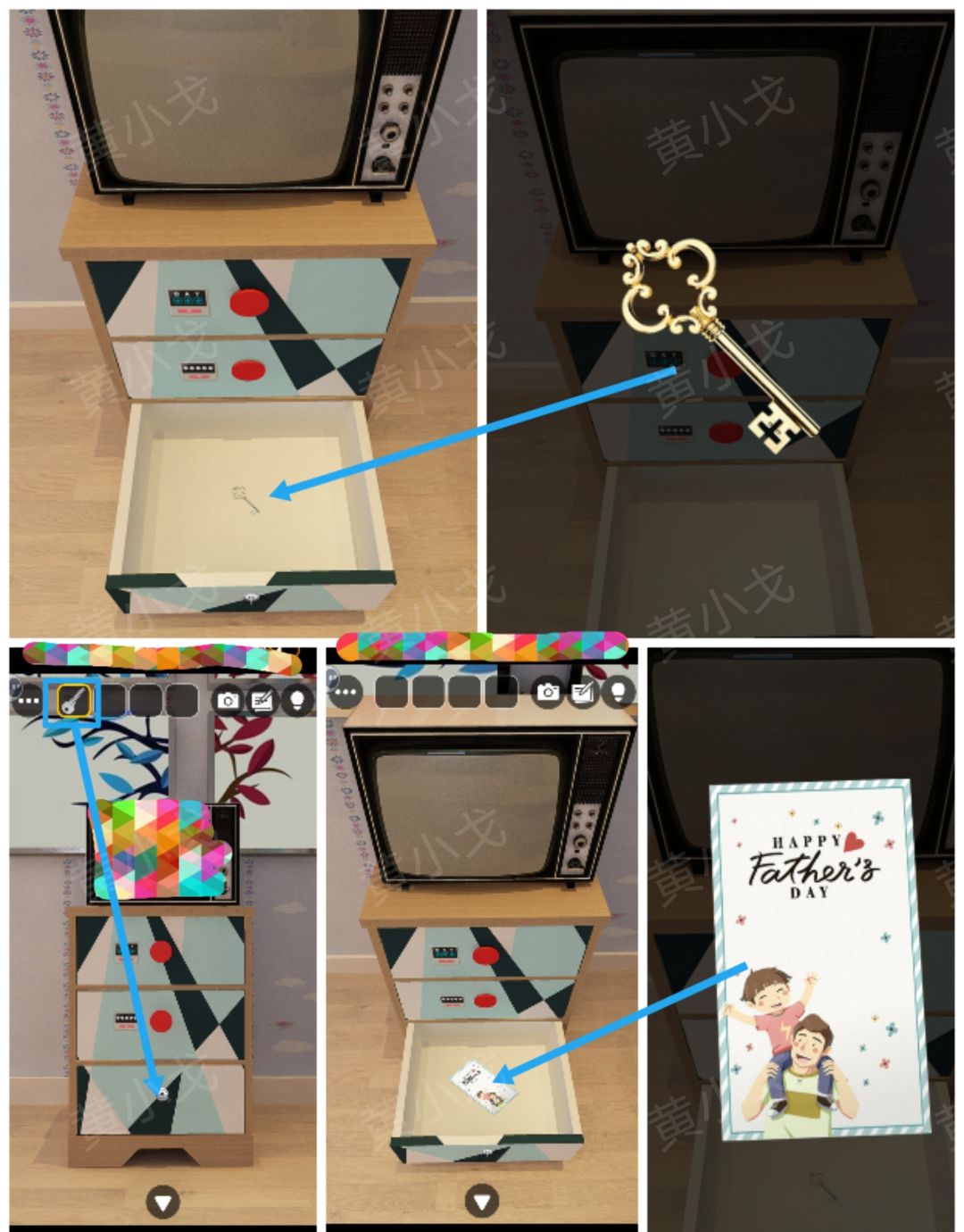 22.点击柜子第三个抽屉上的锁孔,用【钥匙】打开,获得【贺卡】和【钥匙】
