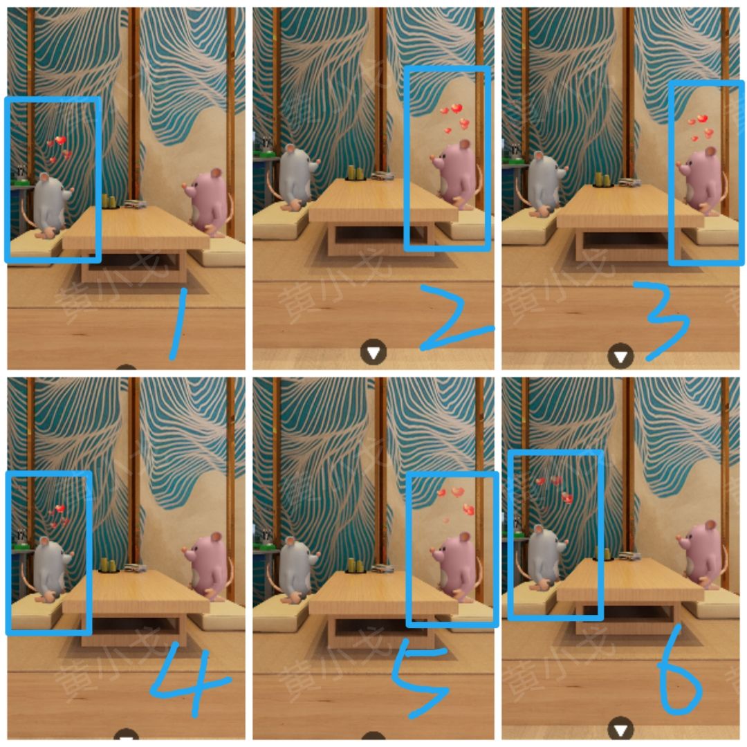 15.点击柜子下层抽屉上的密码锁,根据[茶室]场景两只老鼠头上爱心出现的顺序线索,按正确的顺序点击按钮