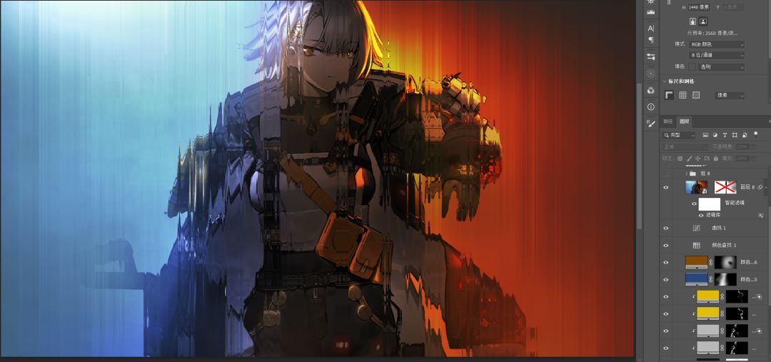观察原图,我认为冷光是隔着雾一般的质感,暖光则像黑夜里的火光,所以让右边更暗,加强这层感觉。