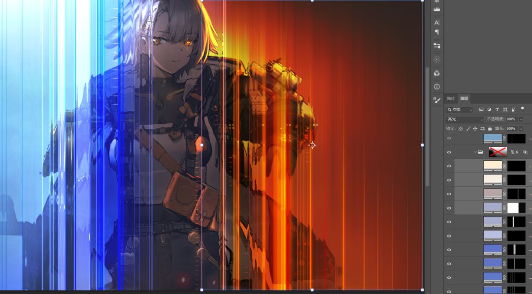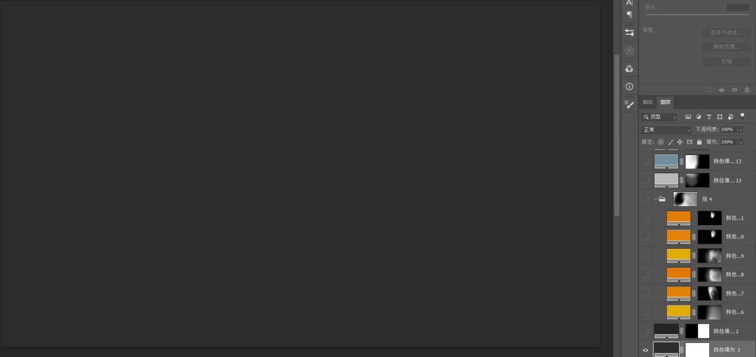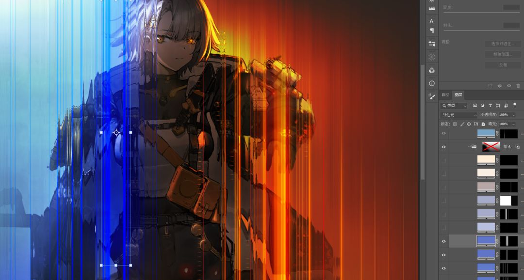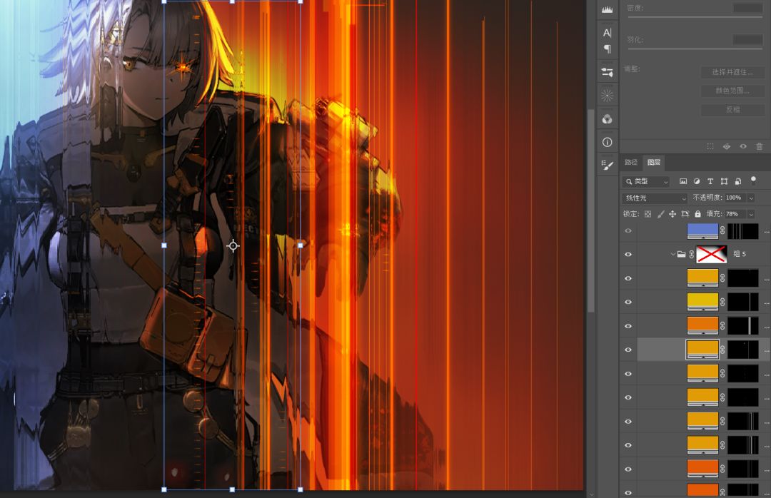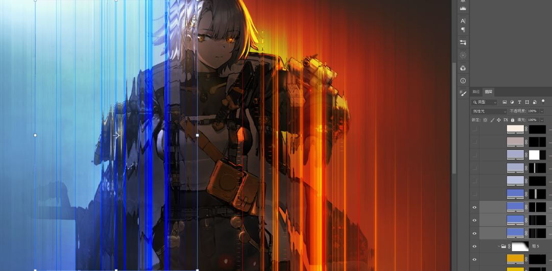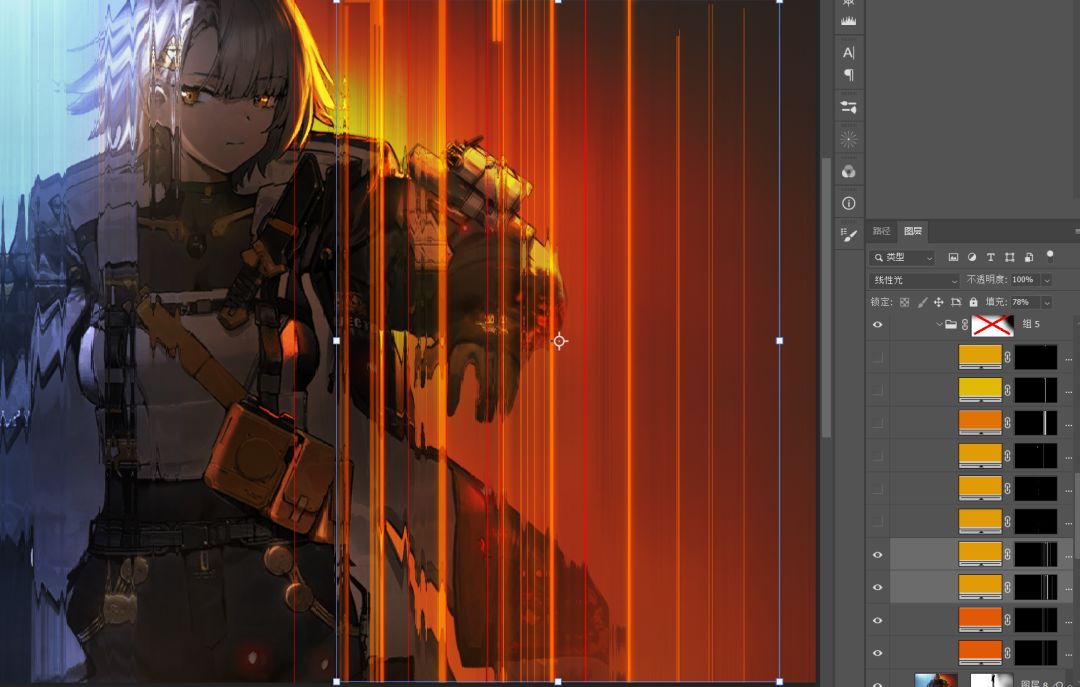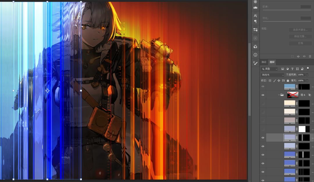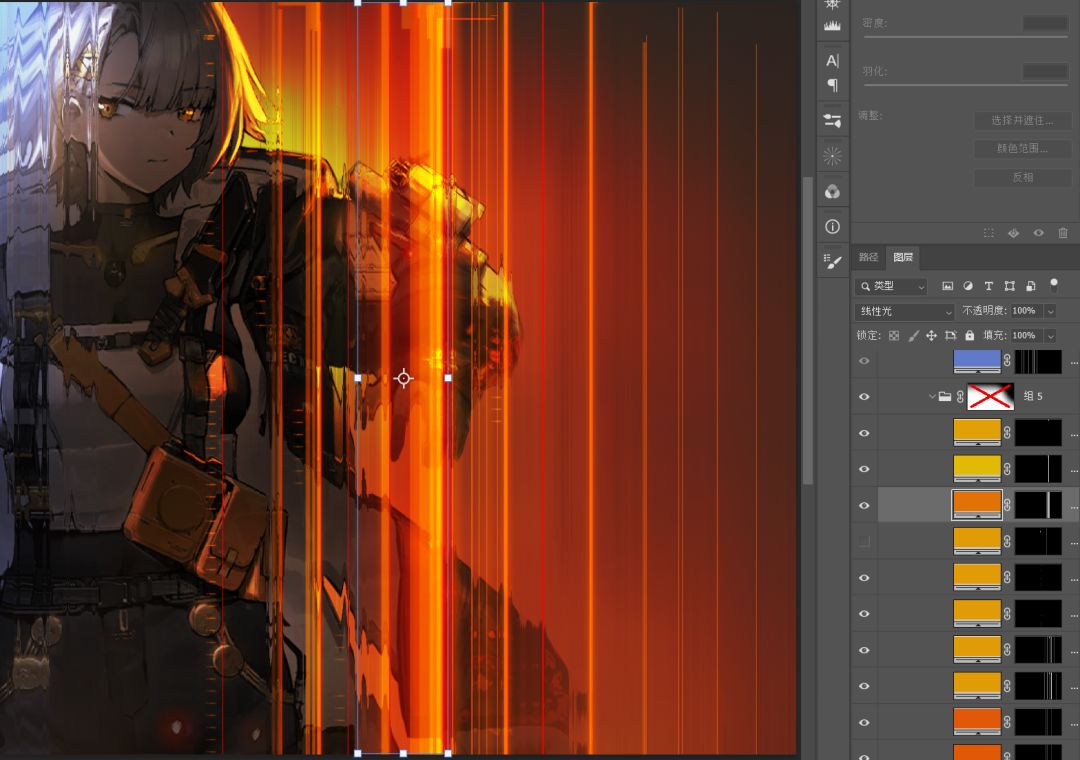 依旧是纯色+蒙版的模式,因为我做了个笔刷,效率会高点。不会做笔刷的话形状工具也是一样能做的。混合模式是线性光。