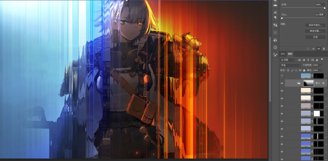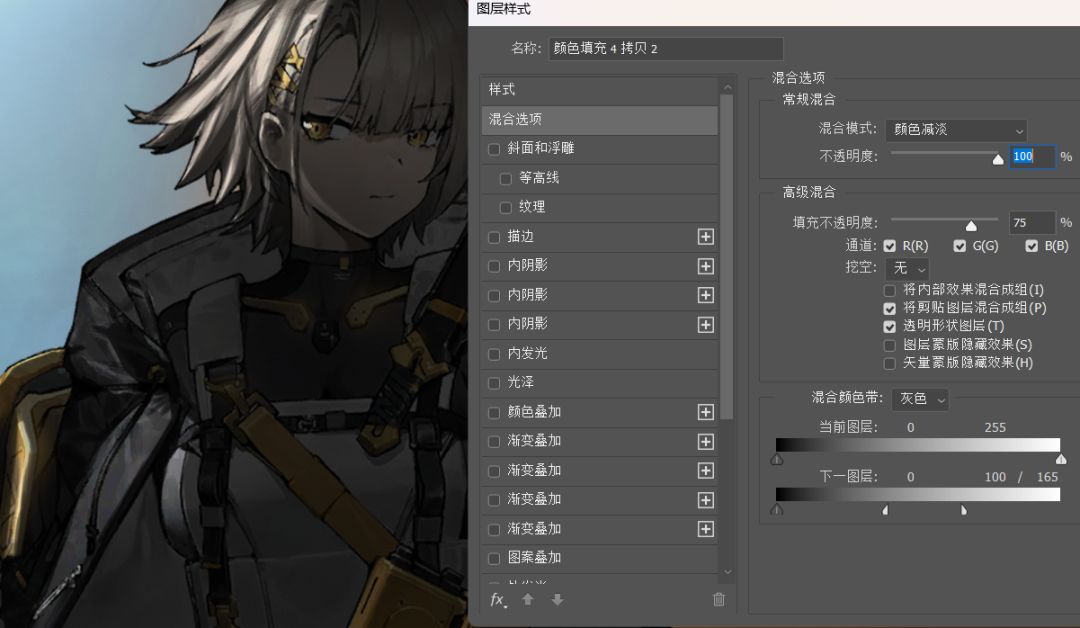 依旧是纯色+蒙版的模式,画光尽量往少了画,更好掌握。画完复制一层,然后双击图层,调整混合颜色带,这里如果你想要加亮光弱的地方,就把白色滑块往左滑(按住Alt点滑块可以拆开它们,这样过渡更平滑)反之则把黑色滑块向右滑。
