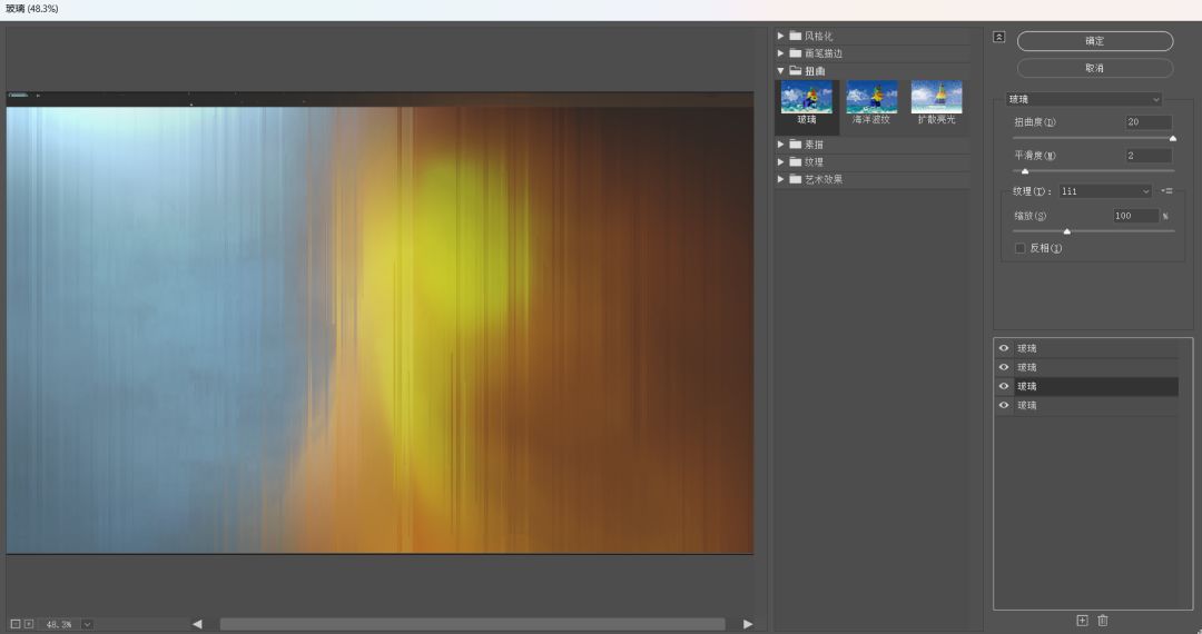 按Ctrl+Shift+Alt+E,将盖印的图层转为智能对象,然后跟背景同理,加玻璃滤镜,数值可以随喜好,进一步可以用蒙版控制它的范围。
