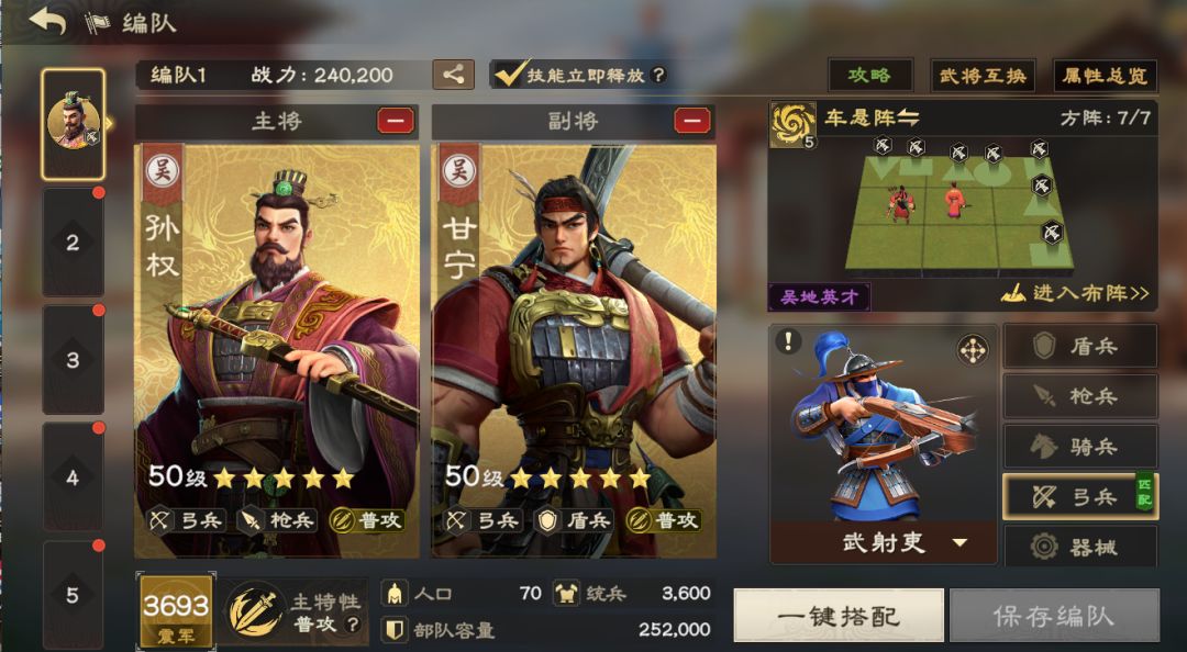 战斗思路:通过武将技能+武将天赋+武将加点+羁绊阵法+精锐兵种的普攻暴击属性叠加,使得普攻暴击率接近100%,搭配甘宁的连击属性,在接战时快速对敌军造成高额伤害,形成血量和人口压制。