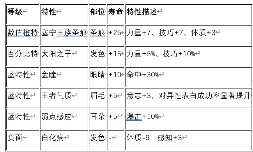 选择该特性会失去:赛宁王族圣痕,力量+7、技巧+7、体质+3,寿命+25