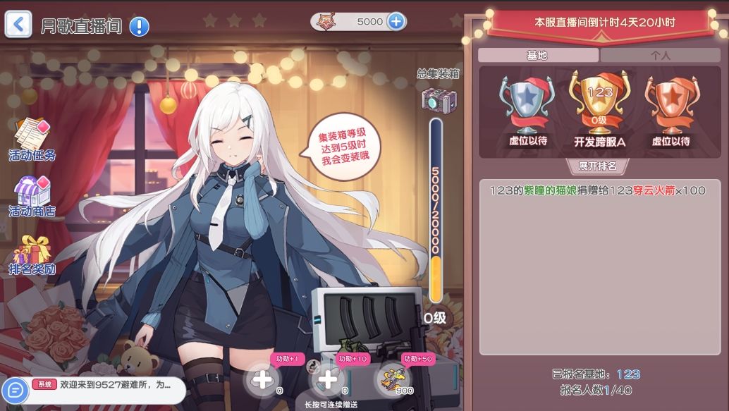 ①原基地集装箱等级调整为全服(跨服组)集装箱,活动期间,所有捐献功勋道具的玩家都可以给该集装箱提供升级经验,提升该集装箱等级可获取对应等级道具奖励;