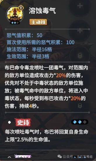 布巴怒气技硝烟俯冲毒龙冲击地面对路径造成伤害,并施加1.5秒嘲讽,进入低空飞行,5秒防御提高50,但可被陆地单位攻击,每受到两次攻击结束低空飞行,且放出范围伤害毒气,神话时低空飞行还有一定比例的生命回复效果