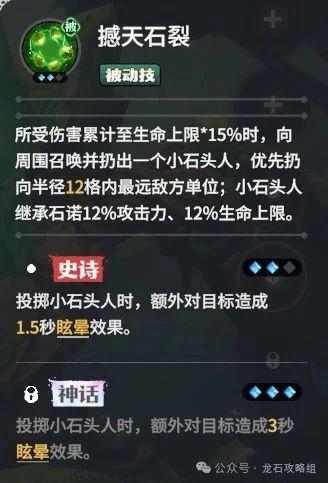 02英雄技能分析1. 石诺石诺被动技撼天石裂受伤后召唤小石头人辅助抗伤可分摊前排压力吸引火力,可以给予后排较好的输出环境,比较适合小规模战场切磋