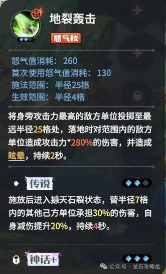 石诺怒气技地裂轰击将敌方前排攻击最高的的单位击飞到最远处以及眩晕2秒和范围伤害,可以让打散对方阵型,使对面前排英雄暂时脱离战场,让我方输出能快速收割前排以及敌方后排