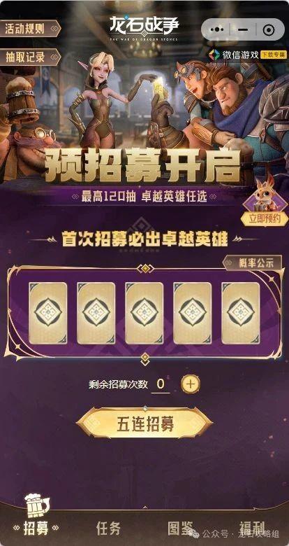 01活动介绍活动基础玩法介绍预招募玩法是《龙石战争》公测预热福利活动,玩家可以通过完成一系列任务获得招募次数,抽取次数,获的奖励,然后选取自己心仪的英雄+所需资源,生成预招募码在公测时领取奖励