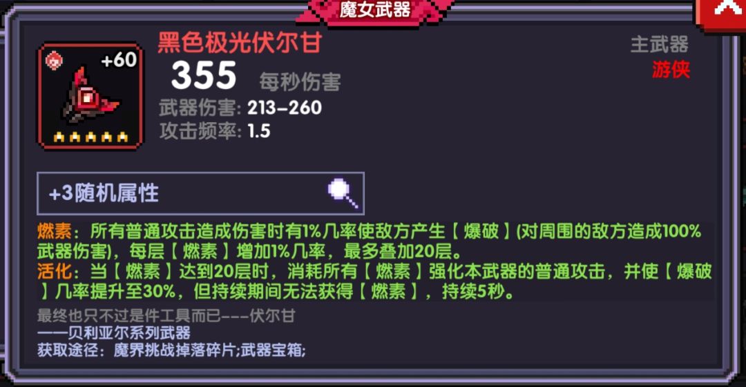 我最初知道勇者的时候,是在一次补习班,看到同学抽卡,一发入魂抽到了游侠的红武,贝利亚尔魔女武器~黑色极光伏尔甘,当时感觉特效真的很好,我也是一个像素游戏爱好者,我也就入坑了这个游戏