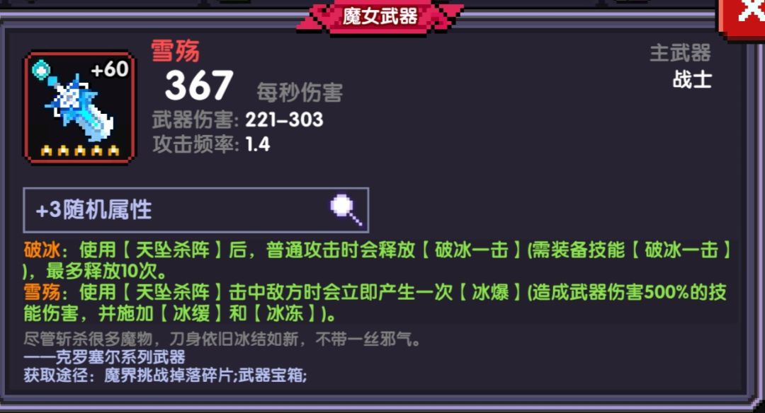 后面一段时间,我的游戏都没有什么起色,都是在沉淀,直到我的第一把五星魔女武器的出现。这个武器就是克罗赛尔战士武器,雪殇