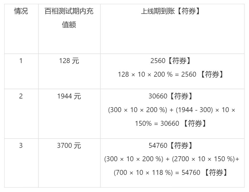 「百相测试」期内所有充值金额的【本金部分】将在游戏正式上线时按以下比例返还至原账号,形式将以等值游戏内货币进行发放。