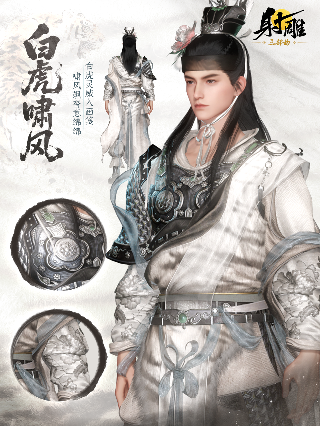 直售外观【白虎啸风】融汇古代甲胄之英武,采用非对称美学。半边是精工锻造、质感厚重的玄色甲胄,半边是垂顺飘逸、物理表现优异的素白布料,刚柔并济,动感十足。衣身与腰间点缀仿真度极高的白色虎纹皮草,毛流感细腻逼真,国风韵味浓厚。