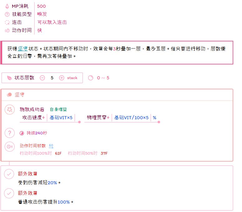 首先看技能,站着不动3S可以叠一层,15秒叠满就有耐力乘以5的攻速,按照400耐力算就是2000速度,还有20的减伤(其他属性可以不用管)缺点是不能动,包括风的拉着,实际上很少能吃满,所以我不推荐你们点缩地很容易吃不到,但是这个可以配合新技能用