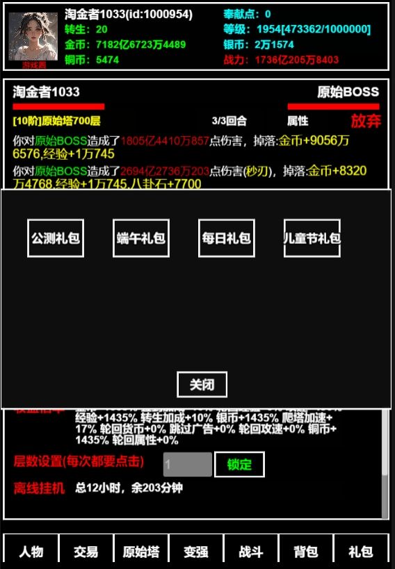 零氪闭环经济:所有装备、技能均通过挂机时间兑换,无付费专属道具。挂机收益随时间指数增长,离线24小时可攒满各种资源。