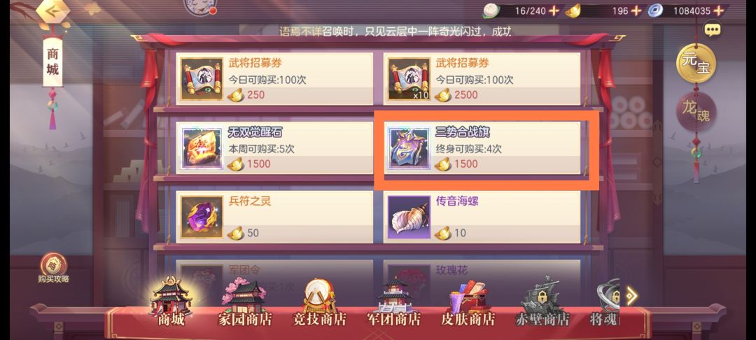 PS:魂·吕玲绮和灵雎组成羁绊需要在【商城】购买【三势力合战旗】