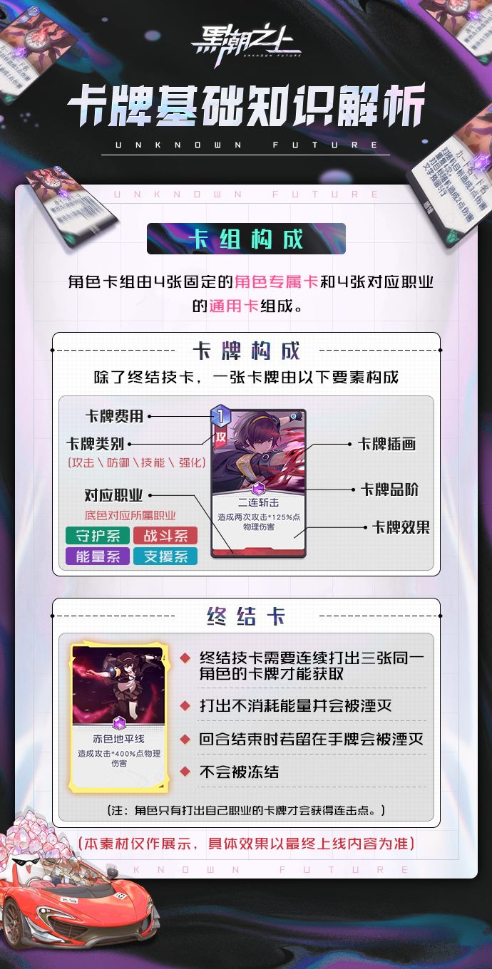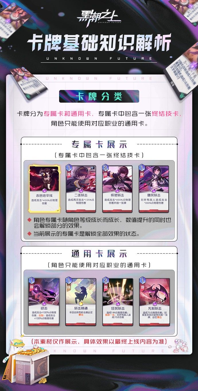 战斗卡牌分为专属卡牌和通用卡牌。每一位角色拥有四张自身独有的专属卡牌(内含一张终结技卡牌),专属卡牌会随着角色等级成长,解锁更多独一无二的属性、机制。而四张通用卡牌则可以在对应的数百张职业通用卡中任意选择,自由搭配,解锁异能少女更多的可能性!
