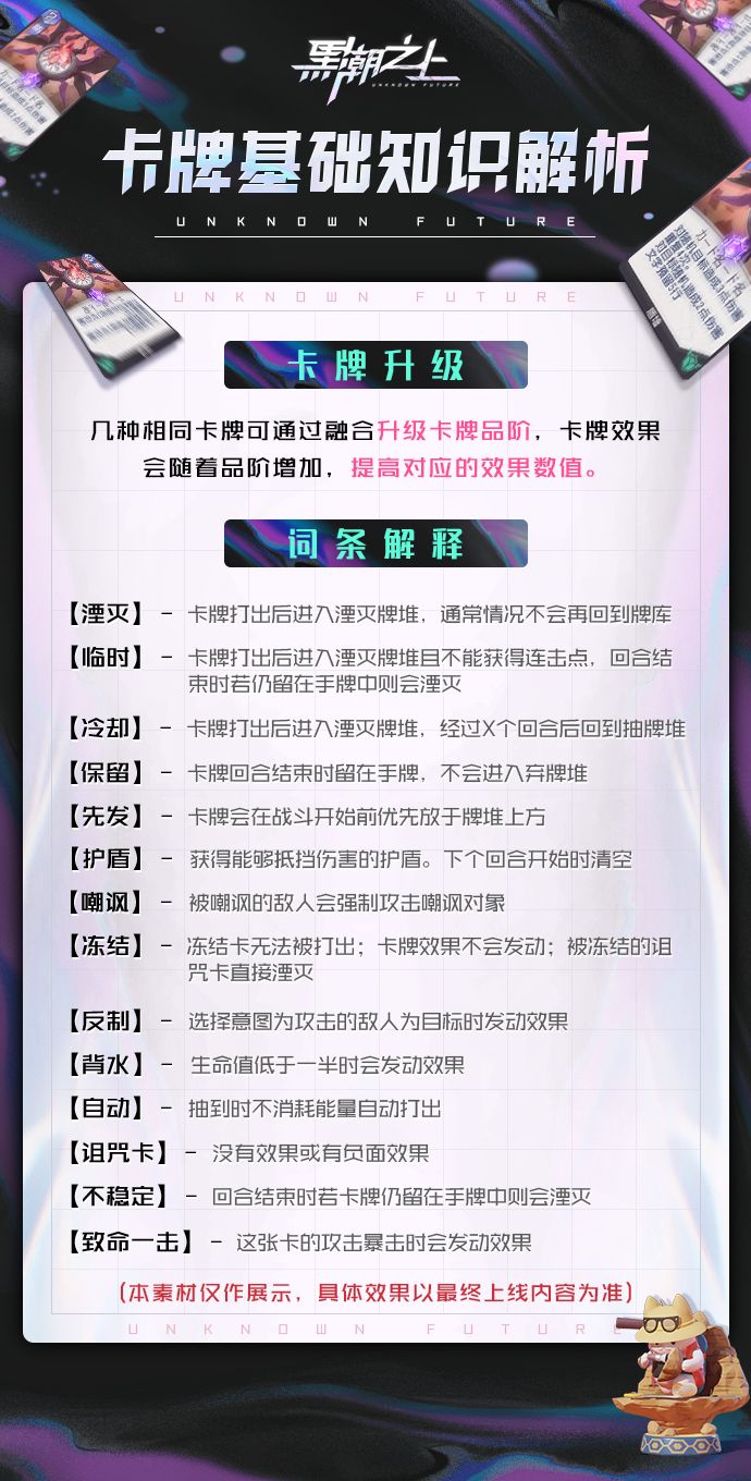 卡牌效果词条共十余种,每一种词条都对应一种特殊效果。例如新手接触者最经常遇到的【湮灭】,它的词条机制便是“卡牌打出后进入湮灭牌堆,通常情况不会再回到牌库。” 【湮灭】词条往往伴随着更为独特的效果一同触发,例如:角色的终结技卡牌,虽然能够带来特殊的收益,但必须在当前回合使用,否则在下回合无论终结技卡牌是否被使用,该张卡牌都会被【湮灭】,不会保留或回到牌库,需要重新连续打出三张同一角色的卡牌才能再次获取。因此,接触者要充分搭配每一张卡牌,并灵活使用【湮灭】机制,用对应的牺牲换来最终收益最大化,从而扭转战局。小编在此为各位奉上更为详细的“词条解释”一览~接触者可以点击图片查阅,掌握并运用更多词条效果。