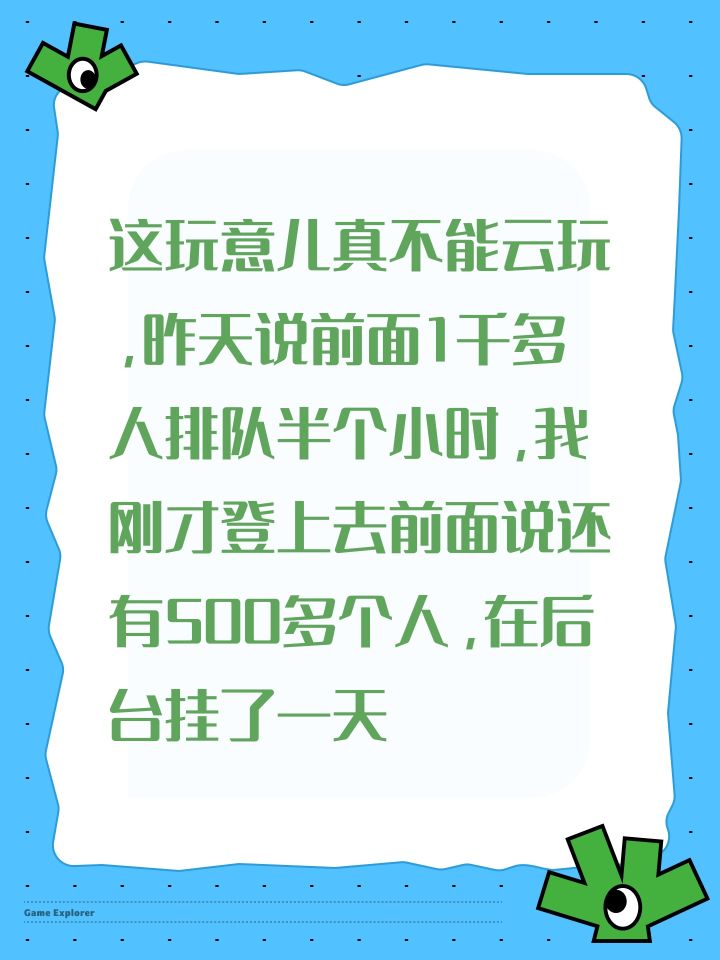 这玩意儿真不能云玩,昨天说前面1000多个人排队,半个小时,结果我现在登上去前面说还有500多个人,让我再等半个小时,在后台挂了一天了