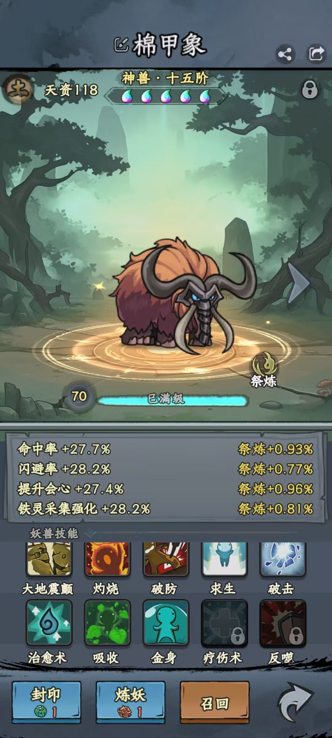 妖兽推荐技能:求生,破击,吸收,治愈术,金身