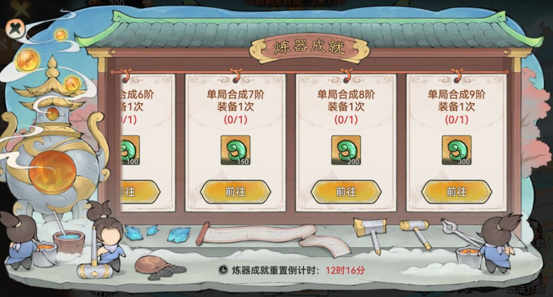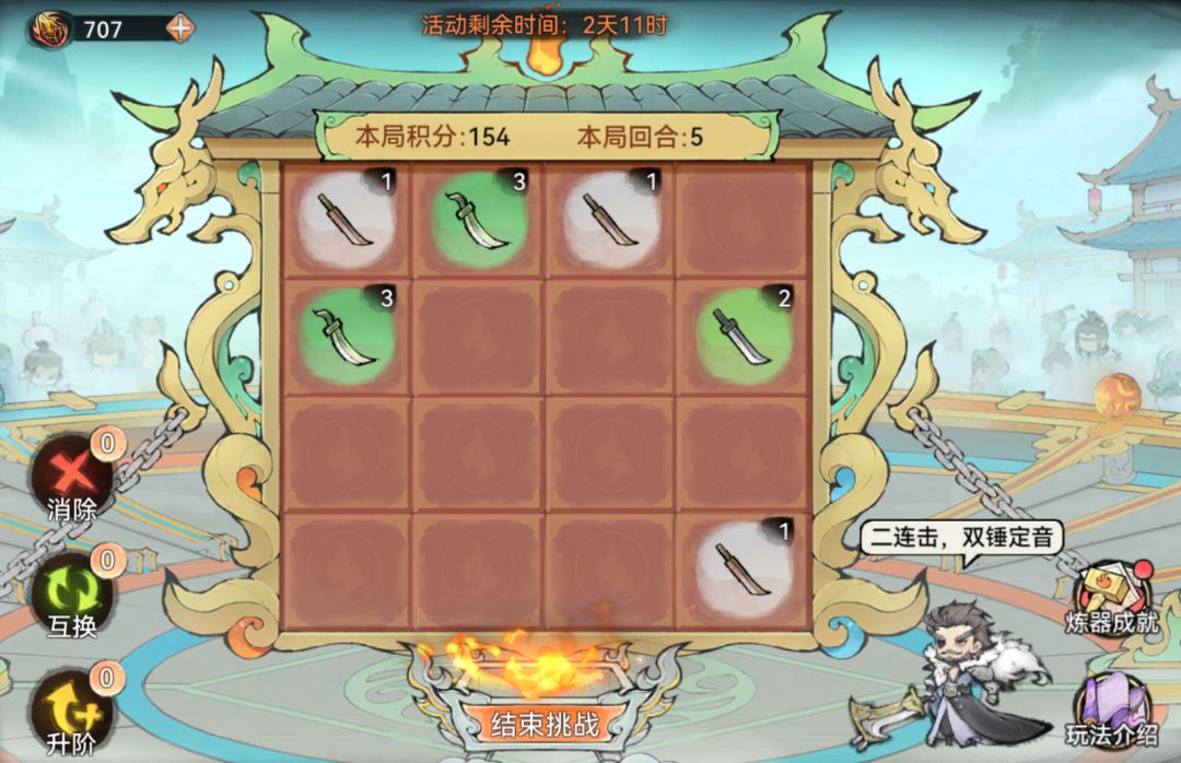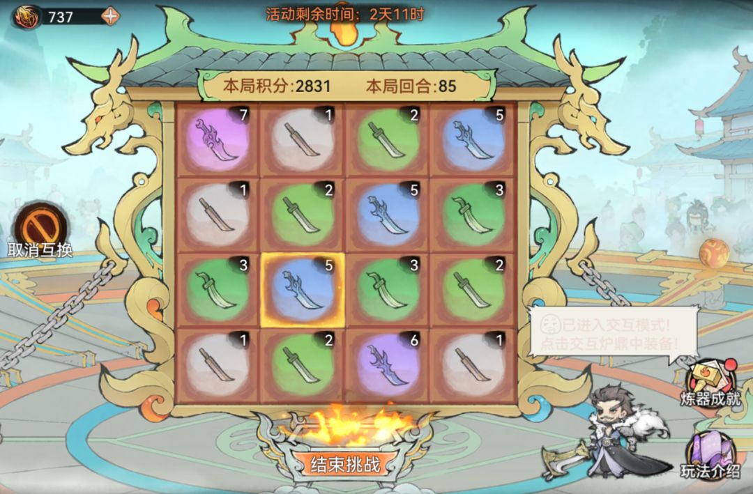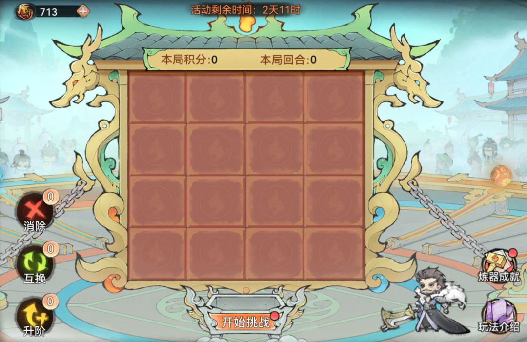 在炼器大会活动中,祖师需要在4*4的炉鼎棋盘上操作,尽可能合成更高阶的装备,以获得更多的积分奖励。