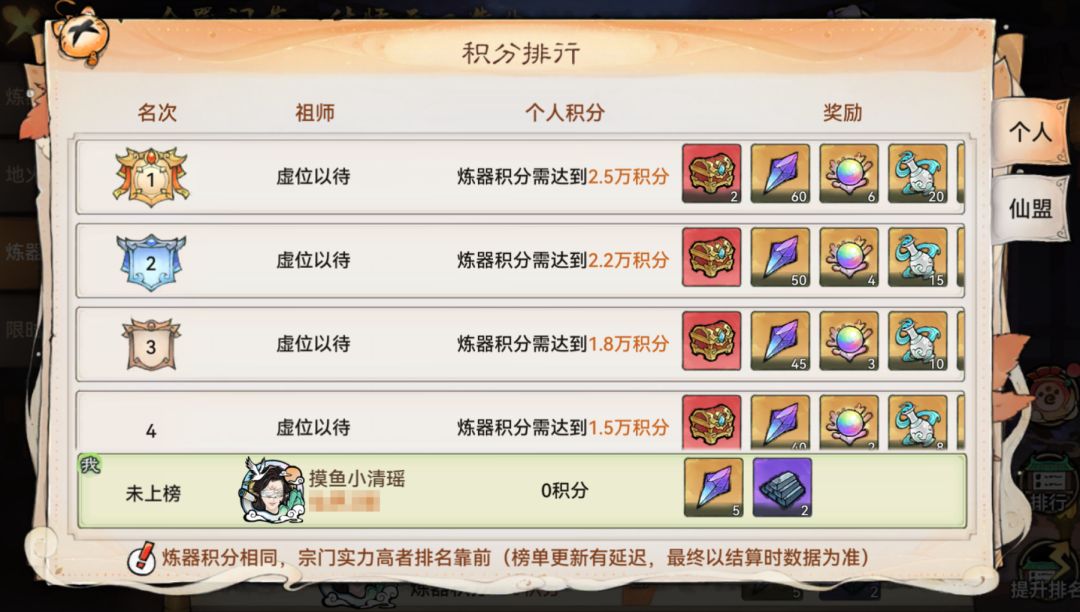 每次结束挑战后,祖师在本局挑战中获得的积分会被统计到“地火金牒”和“炼器排行榜”活动中。