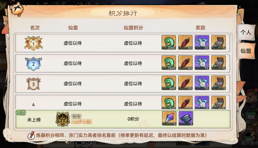 在“炼器排行”活动中,排行榜分为个人排行和仙盟排行,如果积分达到排名要求,则有机会获取法宝原胚自选箱、星辰石英等奖励。
